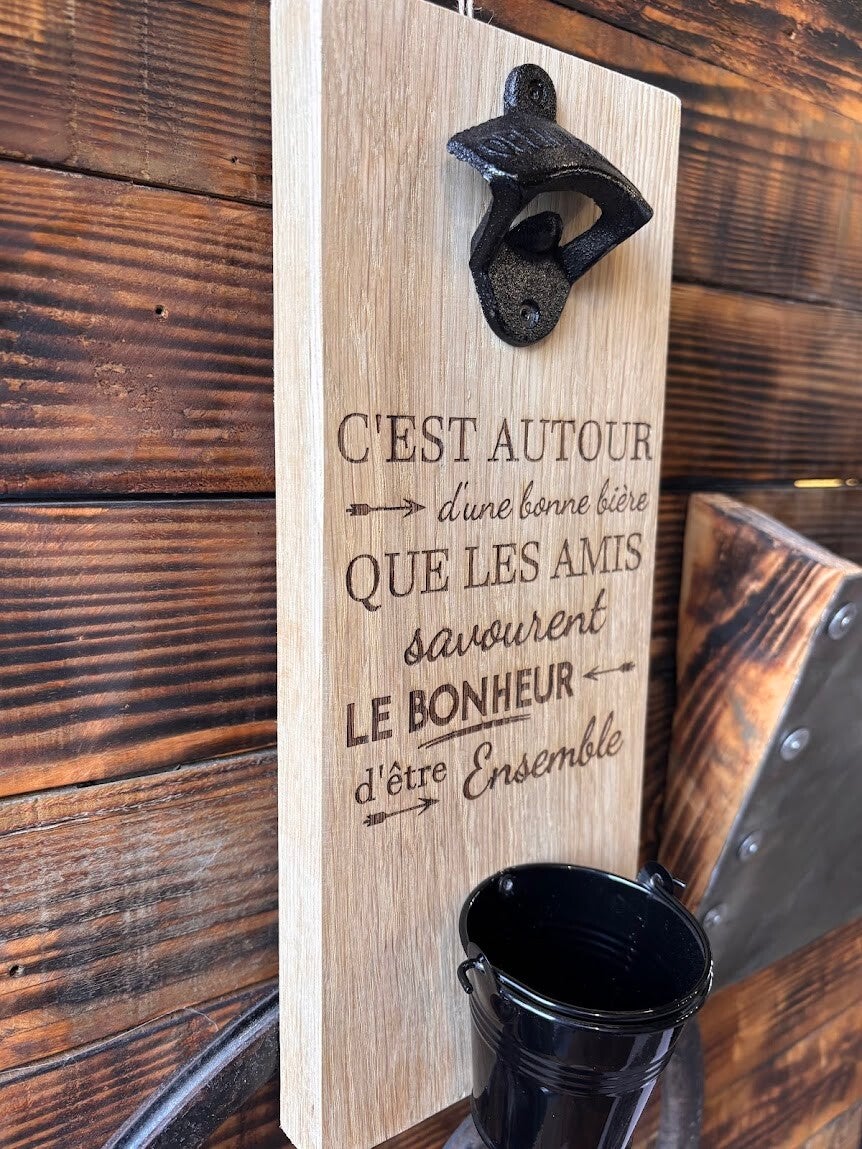 Décapsuleur à bière mural en chêne brut français, "C'est autour d'une bonne bière que les amis savourent le bonheur d'être ensemble..."