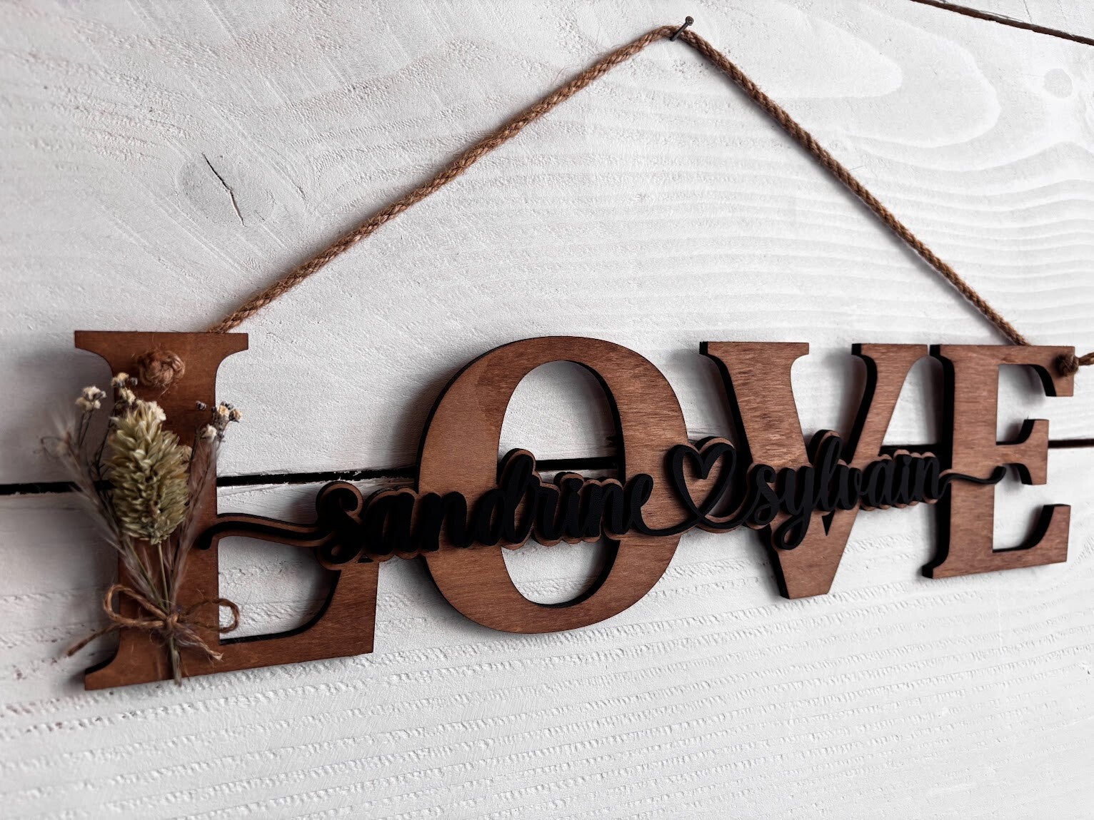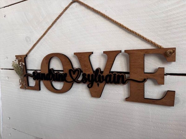Création artisanale. Le mot LOVE est fabriqué en contreplaqué de bouleau 5mm et teinté au brou de noix. Les prénoms sont fabriqués en contreplaqué de bouleau 3mm et peint à la main en noir.